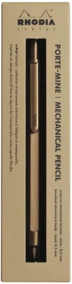 Druckbleistift von Rhodia für Standard-Graphitminen 0,5 mm. Hexagonaler Schaft aus gebürstetem Aluminium. Versenkbare Minenführung aus Stahl. Radiergummi unter dem Druckknopf. In Kartonschachtel mit Fenster, die mit einer transportablen Blisterverpackung aus Kunststoff geschützt wird.
