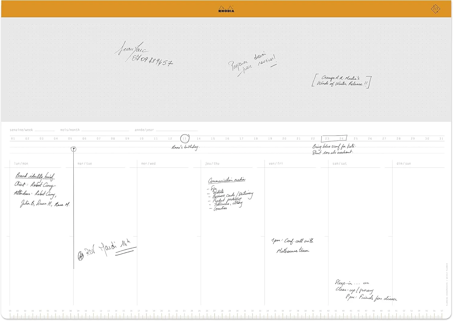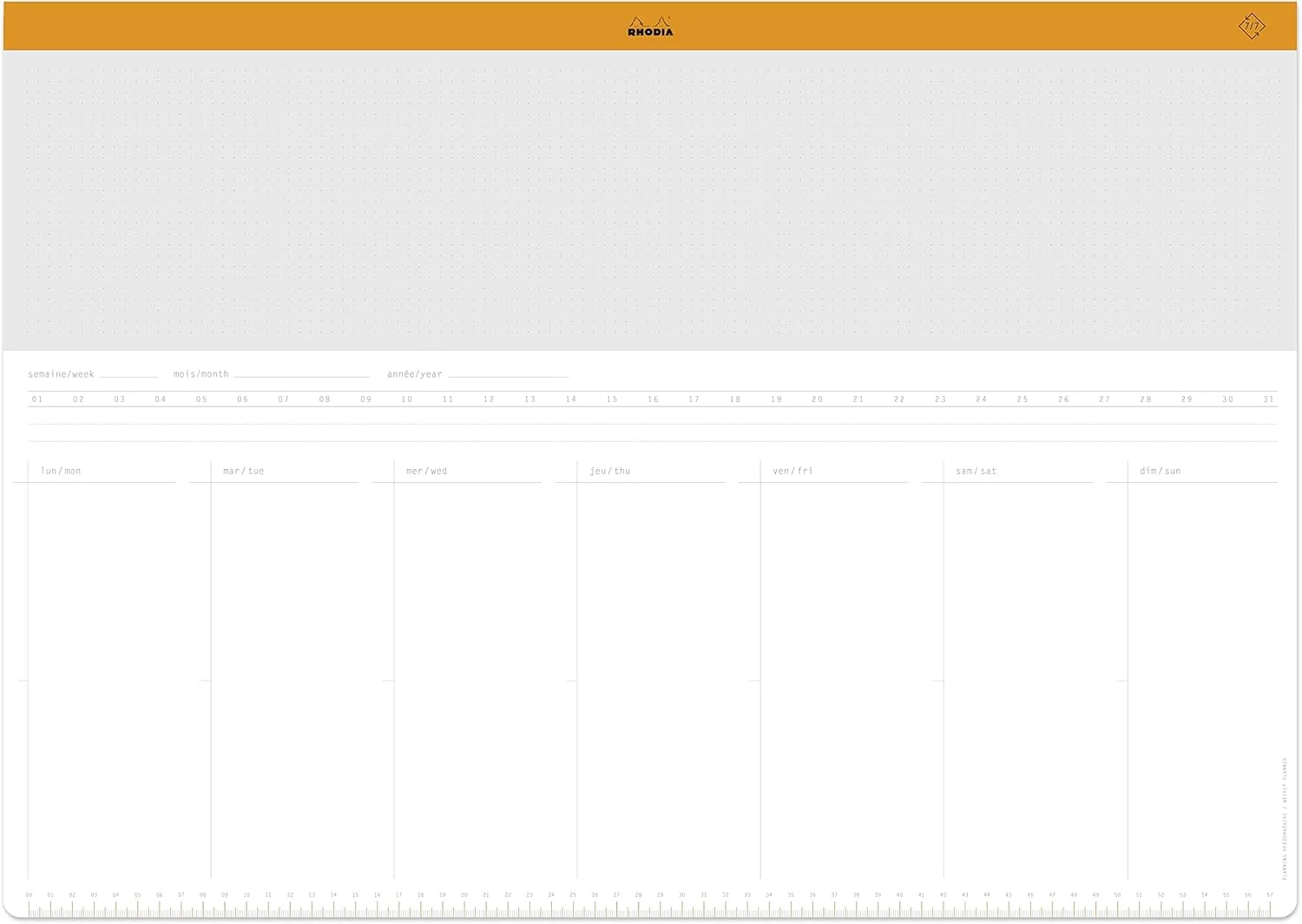 Diese Schreibunterlage mit Wochenkelander ist praktisch wie eine Schreibunterlage und funktional wie ein Wochenplaner. Die 2-in-1 Sc hreibunterlage kann als Mousepad und Unterlage für die Tastatur verwendet werden und ist dient gleichzeitig als Organisations- und Zeitmanagement-Tool. Perfekt, um effizient und produktiv zu sein, konzentriert zu bleiben und sich einen Überblick über die laufende Woche zu verschaffen - sowohl für die Arbeit (Termine, Besprechungen, Fristen, Ziele, Geschäftsessen ...), als auch für sich selbst (Aufgabenlisten, Termine, Projekte, Aktivitäten, Geburtstage...). Neben den nützlichen Abschnitten gibt es auch einen Bereich für Notizen, in dem Sie alles Mögliche notieren oder auch ein paar Skizzen während eines Telefonats machen können. 30 Blatt mikroperforiert und abtrennbar. Leinenrücken. Kartonboden. Rutschfeste Rückseite. Extrafeines Velinpapier 80g.