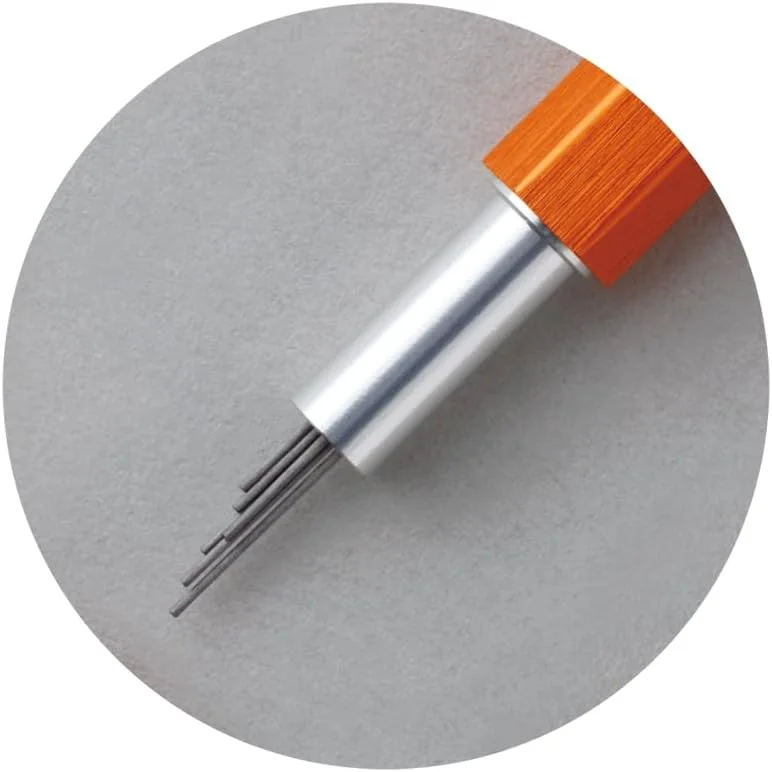 Etui aus gebürstetem Aluminium und Box mit 20 Graphitminen 0,5 mm zum Nachfüllen.